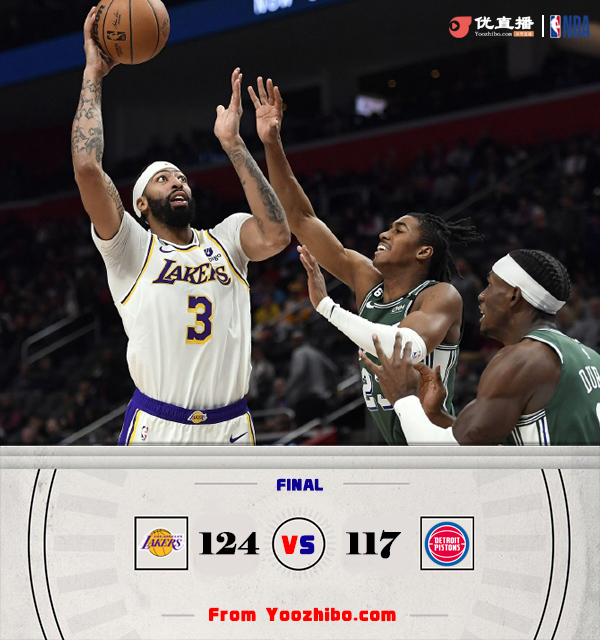 NBA常规赛,湖人客场挑战活塞。加时惜败76人后,湖人又遭遇3连败,目前仅列西部倒数第三,活塞则东部垫底。比赛开始,湖人率先发力,内外开花很快取得两位数领先,活塞轮番冲击篮筐努力追赶,詹姆斯高效输出,威少也连送助攻,湖人牢牢占据场上主动,半场战罢湖人61-49领先。易边再战,活塞大举反击,多点开花不断蚕食分差,浓眉单节爆砍17分顶住对方的反扑,湖人连中三分稍稍稳住局势,活塞不断迫近分差,关键时刻里夫斯命中三分帮助球队锁定胜局。最终,湖人力克活塞,结束3连败。