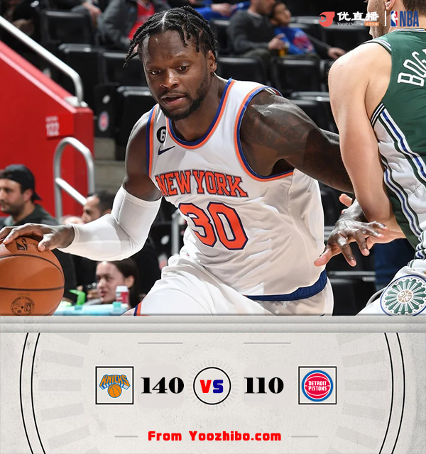 24直播网11月30日讯 NBA常规赛继续进行,活塞主场迎战尼克斯,本赛季两队状态都不好,目前都经历了两连败,尼克斯9胜11负排在东部第12,而活塞则是5胜17负东部垫底。比赛开始,尼克斯进攻端迅速进入状态,作为联盟三分球最差的球队,尼克斯却一改常态在半场就轰进11记三分,而兰德尔更是状态火热,半场扔进6记三分怒砍26分帮助尼克斯建立双位数领先,活塞由于伤病只能靠博扬和巴格利一内一外勉强回应,随后尼克斯进攻端越打越好,第三节打出38-21的单节比分直接领先到30分以上,比赛彻底失去悬念,最终尼克斯140-110大胜活塞,终止连败的同时送对手3连败。