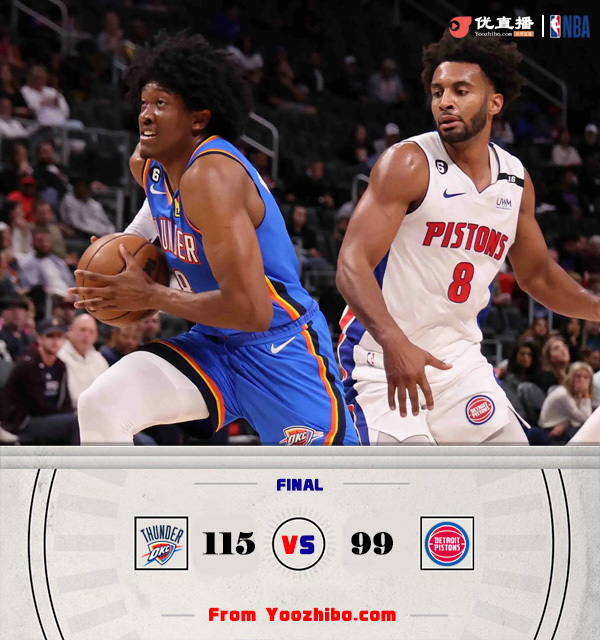 NBA季前赛今日继续,活塞迎战雷霆。两队新赛季都将继续以锻炼新人为主。一开场,雷霆连中三分,活塞内外开花给出回应。巴格利伤退,活塞三分4连击领先4分结束首节。次节上来,双方依旧打得难解难分,比分交替领先,双方互送进攻高潮,活塞半场结束时57-54领先3分。易边再战,雷霆连续打出进攻高潮取得两位数优势,活塞顽强追赶,三节打完雷霆反超8分。第四节,雷霆持续发力将分差拉开到20分,活塞大势已去无力回天。最终,雷霆115-99击败活塞,取得胜利。