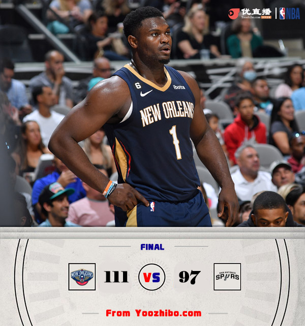 NBA季前赛,马刺对阵鹈鹕。马刺想要得到文班亚马的心已经路人皆知,鹈鹕这边续约麦科勒姆和锡安后继续保持一定的竞争力。一开场,鹈鹕率先发力取得领先,马刺奋力反击,首节结束鹈鹕领先4分。第二节,双方继续缠斗,比分咬得很紧,半场战罢鹈鹕50-44领先6分。下半场,马刺一度将比分扳平,但此后突然断电,鹈鹕一波14-0的进攻高潮领先21分进入末节。第四节,双方轮换阵容旗鼓相当,鹈鹕轻松将优势保持到了最后。最终,鹈鹕111-97轻取马刺,顺利过关。