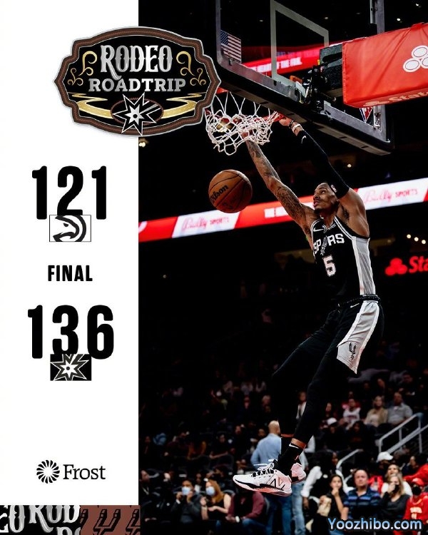 NBA常规赛继续进行,老鹰坐镇主场迎战马刺队,此役马刺新援理查德森等人缺阵。首节开战,马刺进攻端状态火热,全队本节外线手感出色,三分十投八中,也使球队很快建立了领先优势,节末老鹰连续两记三分稍稍迫近比分,马刺43-29领先结束第一节。次节上来,马刺外线机会变少,两队连续在内线做文章,老鹰逐渐缩小分差,一度只落后6分,但突然又陷入得分荒,马刺顺势打出8-0重新稳住局面,节末,马刺再接连命中三分,珀尔特尔超远压哨三分也中,马刺73-56保持领先结束上半场。易边再战,马刺前半节延续上半场进攻状态,逐渐拉大分差,一度领先至26分,但随后进攻突然断电,老鹰很快打出一波11-0迫近分差,节末穆雷连得四分稳住局面,三节结束马刺103-87领先。末节上来,两队交替取分,老鹰无法防住马刺的进攻迫近分差,随着约翰逊再连得五分,老鹰换上替补,马刺随后也换人,比赛进入垃圾时间,最终全场结束,马刺136-121客场大胜老鹰。