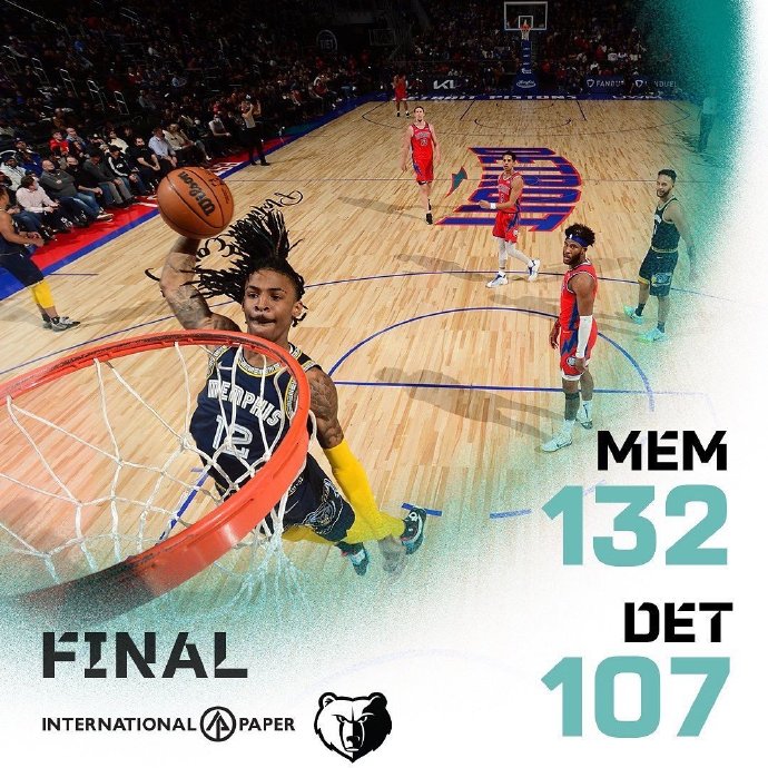 [微博全场集锦] 莫兰特23+6 贝恩22+6 灰熊7人上双轻取活塞迎4连胜