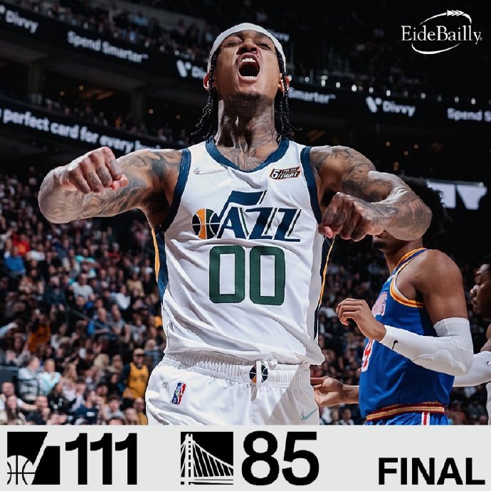 勇士带着9连胜的火热势头奔赴盐湖城挑战爵士,爵士在米切尔回归之后状态逐渐稳定下来,最近取得3连胜表现同样出彩,阵容方面克莱本场轮休缺阵。首节之争勇士在开局一波13-0的完美开局之下却没能守住优势,爵士后半节及时苏醒并回敬14-2的攻势迅速追上比分。次节前半段两队疯狂打铁完全找不到状态,勇士单节仅得18分状态远低于自己的平均水准,而爵士抓住对手低迷的状态取得6分领先进入下半场。第三节勇士开场8-0的攻势一度让人看到“勇三疯”的苗头,然而他们也仅仅展露了一丝丝的苗头而已,爵士仅仅用了一个暂停就解决问题,随后的他们万箭齐发轰出24-8的攻势一举反超取得两位数领先,末节开局爵士彻底接管比赛,康利和克拉克森联手命中三记三分带队打出13-2的攻势并确立起25分领先奠定胜局。最终,爵士主场轻取勇士迎来4连胜,同时也终结了勇士9连胜。