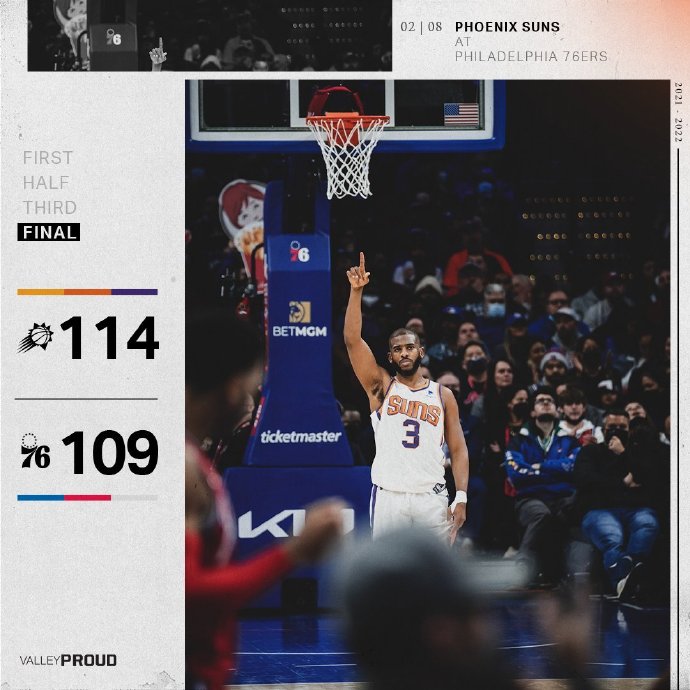 76人今日坐镇主场迎战太阳,76人最近3战2负状态稍有下滑,而太阳除了输给老鹰外,近期其余的13场比赛全部取胜状态火热。首节之争76人在开局被动的情况下依靠恩比德连砍10分迅速追上比分,不过作为领头羊的太阳并非泛泛之辈,随后的替补轮换里他们依靠更加全面的进攻表现取得4分领先。次节76人开场一波9-2的攻势迅速追上比分,随后的激烈争夺战中,76人最后时刻再送7-2的小高潮反超4分进入下半场。下半场的拉锯战更加激烈,太阳在最多落后11分的情况下及时自救,凭借第三节后半段和第四节初的出色表现他们甚至实现反超,胶着局势也将悬念一直保留到最后,关键时刻太阳这边保罗和布克轮番打成关键球确立领先,而76人却出现致命失误错失追分机会。最终,太阳客场险胜76人迎来3连胜。