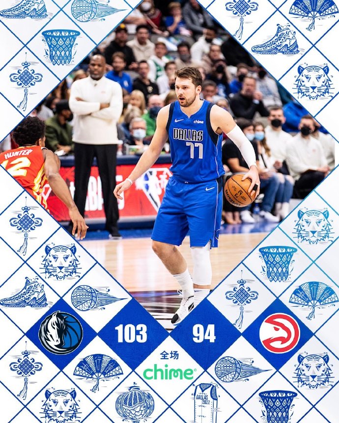 NBA常规赛,独行侠主场迎战老鹰。独行侠本赛季表现尚可,目前排在西部第五,老鹰则表现一般,上赛季杀入东部半决赛的他们现仅位列东部第十。波津和路威本场缺阵。一开场,双方互送进攻高潮,比分交替领先,独行侠凭借8-2的攻势领先3分结束首节。次节比赛,双方你来我往互不相让,独行侠始终保持微弱优势,半场战罢独行侠54-50领先4分。易边再战,东契奇很快领到个人第5次犯规并且赔上技术犯规,特雷-杨带队一度将比分扳平,独行侠连中三分,依然领先4分进入末节。第四节,前半段双方难分伯仲,后半段独行侠多点开花打出12-2的攻势杀死比赛。最终,独行侠力克老鹰,主场过关。