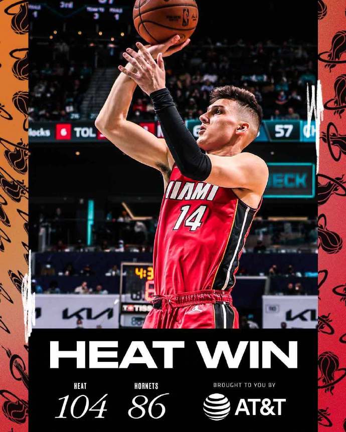 NBA常规赛继续进行,黄蜂坐镇主场迎战热火,此前黄蜂已经三连败,本场比赛斯特鲁斯,麦克丹尼尔斯等缺阵。首节上来,双方连续在对方禁区做文章,比赛陷入拉锯战,节末黄蜂陷入得分荒,热火稳扎稳打,一波9-0的小高潮一举建立领先优势,31-23进入第二节。次节上来分差很快来到两位数,但是此后黄蜂稳扎稳打逐渐蚕食分差,布里奇斯连得五分帮助黄蜂取得反超,巴特勒连续取分止血,节末罗齐尔连得五分,帮助黄蜂51-46反超结束半场。易边再战,场上形势风云突变,热火连续得分很快取得反超,黄蜂在本节则陷入巨大的得分荒,热火稳扎稳打,单节打出35-8建立巨大领先优势,三节结束81-59领先到22分。末节上来,双方已经基本换下主力,希罗三分连续命中很快将分差拉开到30分,比赛失去悬念,节末华盛顿带领黄蜂连续取分稍稍迫近分差,最终热火客场104-86大胜黄蜂,送给对手四连败。
