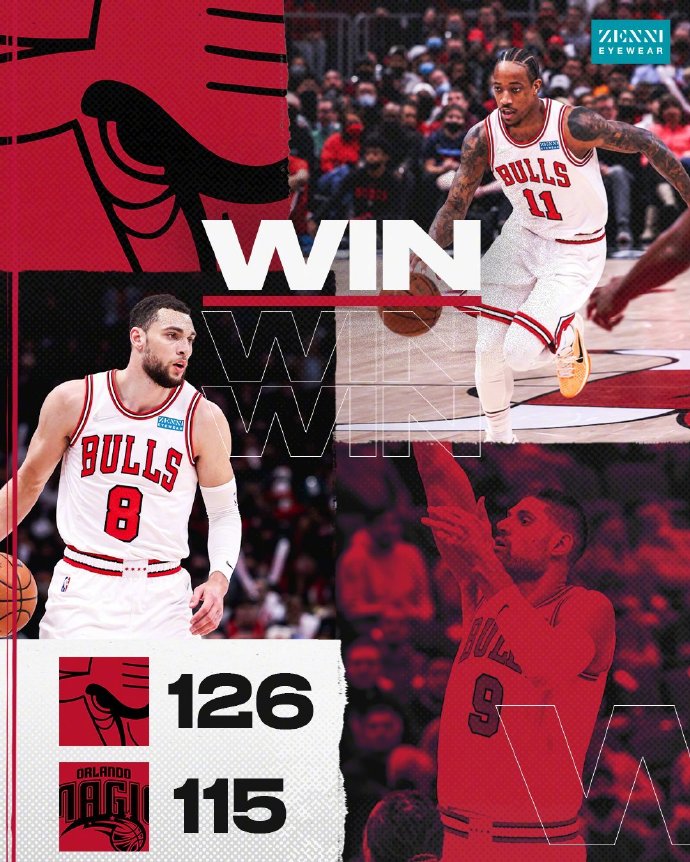 公牛(32-18):德罗赞29分10篮板5助攻2抢断1盖帽、拉文26分5篮板3助攻、武切维奇18分13篮板2助攻2盖帽、道苏姆13分9助攻、贾旺特-格林11分7篮板2抢断、小布朗9分3篮板、怀特9分5助攻3篮板、泰勒-库克6分5篮板、马特-托马斯3分、布拉德利2分