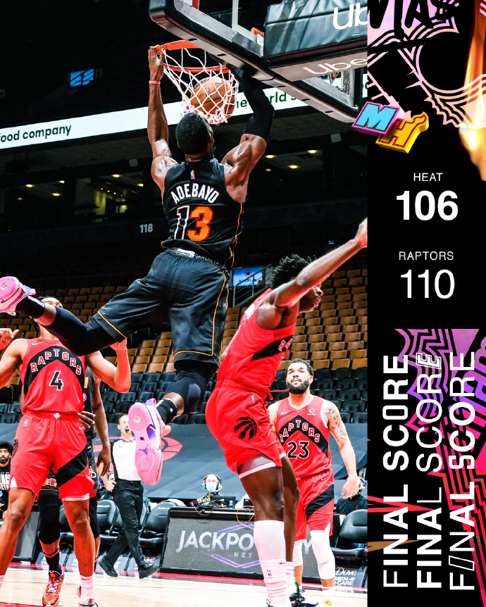 NBA常规赛,猛龙主场迎战热火,两队三天前曾大战三个加时,最终猛龙艰难胜出,此役双方均是背靠背作战。首节热火反客为主取得10-3的不俗开局,猛龙之后虽略有复苏无奈防守不给力,热火很快取得了两位数的领先,次节阿丘瓦、特伦特等人轮番发威,几次将分差缩小到个位数,无奈节末阿德巴约大发神威连得6分,热火在半场结束时依旧保有12分的优势。第三节范弗里特终于复苏,他一人连砍11分带队打出一波14-3瞬间迫近比分,可惜球队罚球命中率不高错失了扳平的机会,热火靠着阿德巴约与巴特勒的强攻勉强维持住优势,末节西亚卡姆、阿丘瓦、特伦特三分如雨,猛龙一波10-0终于反超比分,纵使希罗此后带队连续追分却为时晚矣,阿奴诺比空接上篮杀死比赛。最终,猛龙110-106逆转击败热火取得三连胜。