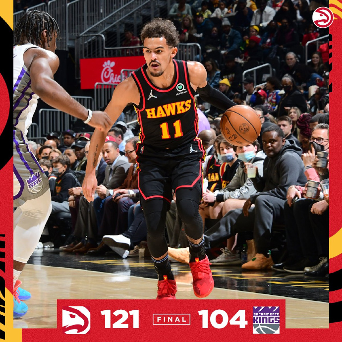 NBA常规赛继续进行,老鹰坐镇主场迎战国王,此前老鹰获得四连胜,国王则在遭遇四连败,此役福克斯等人缺阵。比赛上来米切尔手感火热,四投四中帮助国王建立领先优势,老鹰这边则手感不佳,分差很快被拉大到两位数,首节结束国王33-21暂时领先。次节回来,奥孔武连续在篮下暴扣取分,博格丹手感火热,外线连续命中帮助老鹰追平并反超比分,米切尔和巴恩斯连中三分止血,但本节最后三分钟国王没有再得分,老鹰这边则是愈战愈勇,特雷-杨准压哨超远三分命中后,老鹰单节46-17净胜29分,半场结束67-50领先。易边再战,老鹰这边延续手感,分差很快被进一步拉大,特雷-杨超远三分飙中后,分差一度来到30分,随后国王状态回暖,打出一波13-2缩小分差,三节结束老鹰94-74领先。末节特雷-杨等老鹰主力没有再上场,两队交替取分,国王每次缩小比分,老鹰总能作出回应,最终老鹰主场121-104大胜国王,取得五连胜的同时送给对方五连败。