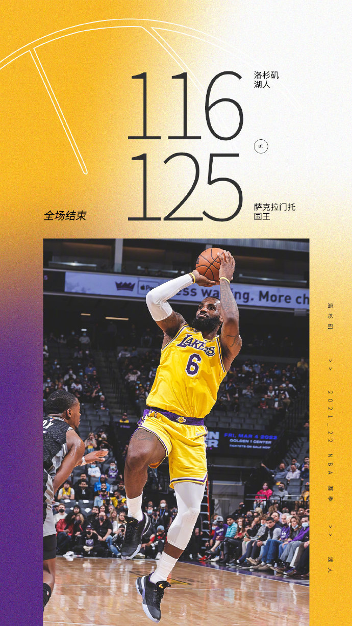 NBA常规赛继续进行,国王主场迎战湖人,国王此前状态不是很好,一波5连败已经掉落至西部第12位,而湖人4连胜后惨败于灰熊目前也掉落至西部第7位,本场安东尼因腰部紧张缺阵。开局湖人外线手感不错,但国王也是连续冲击内线给出回应,双方打得非常胶着,湖人依靠自身的经验优势,在詹姆斯的带领下占据5分领先,次节国王上来外线手感不错将比分追平,但詹姆斯又站出来里突外投帮助湖人打出超级进攻波一举建立双位数领先,节末国王也回应8-0小高潮将分差又追至6分。第三节风云突变,虽然湖人外线三分还能帮助止血,但国王通过连续冲击湖人孱弱内线,配合着外线巴恩斯的三分,国王打出超级进攻波并单节轰下40分一举建立双位数的领先,末节湖人依靠外线三分紧急追分,但国王也都能给出回应,双方外线对飚,但国王始终保持领先,虽然最后时刻詹姆斯一度帮助湖人追到差2分,但梅图三分一击毙命,最终国王击退湖人,终止自己的5连败。