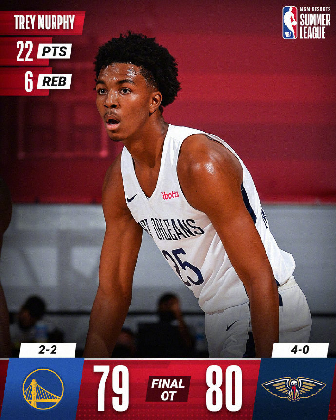 NBA夏季联赛勇士对阵鹈鹕,开场后勇士首先进入状态,但墨菲发挥神勇带领鹈鹕一度反超比分,第二节勇士外线找到手感,但鹈鹕通过突破和反击也毫不示弱,两队上半场打成37平。下半场两队仍旧打得势均力敌,两队多次打成平手,马绍尔补篮点进将比赛拖入加时,加时赛中墨菲关键补篮绝杀,最终鹈鹕加时80-79险胜勇士。