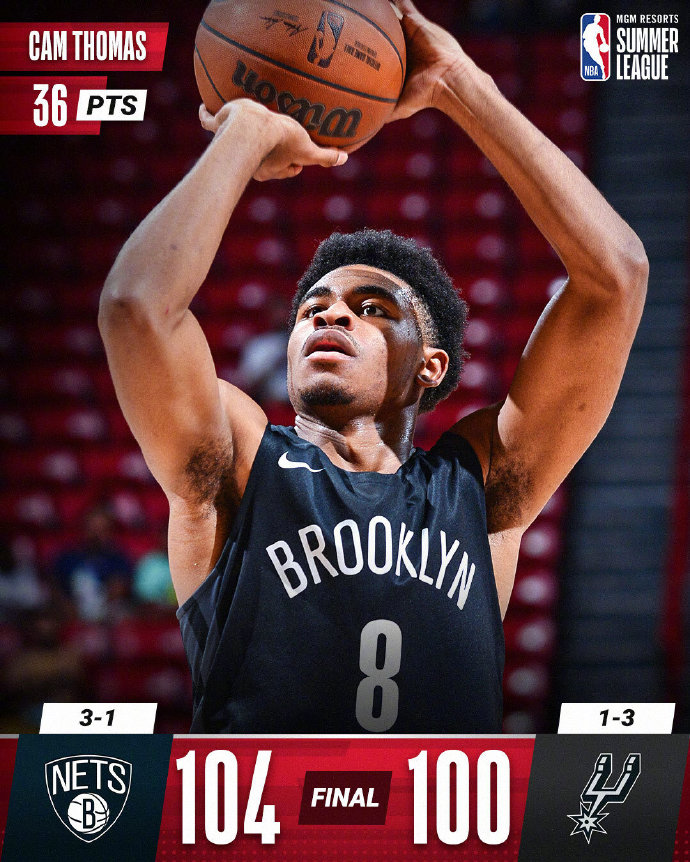 NBA夏季联赛,篮网今日对阵马刺,前者已经取得两连胜,而后者在上场比赛才险胜黄蜂取得首胜。比赛上来马刺就展示了火热的外线手感,连续命中多记远投,而篮网的进攻效率则是极低,场上分差迅速就达到了两位数,次节篮网虽然多次发起追分,但半场结束时仍落后5分。易边再战篮网继续反扑,在第三节末段他们打出一波10-2的攻势终于实现反超,末节两队开始陷入拉锯,比赛悬念一直保持到了最后,关键时刻托马斯连续得分帮助篮网带走胜利,最终篮网险胜马刺,获得三连胜。