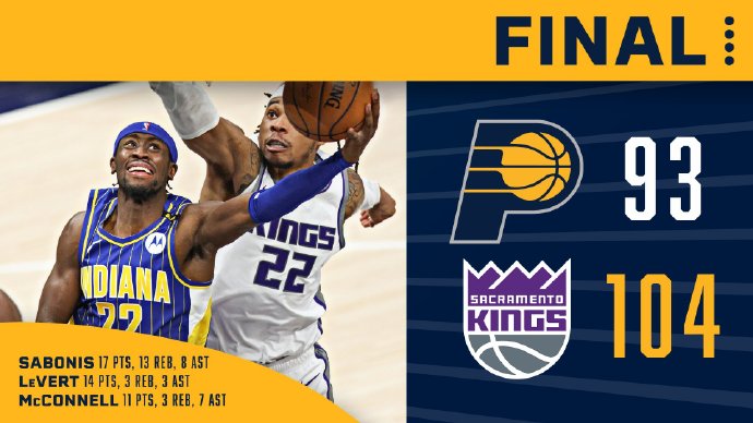 NBA常规赛,国王背靠背客场挑战步行者,虽然近期3连胜的国王目前排名西部第12,但冲进季后赛附加赛理论上还是有机会的;步行者上场不敌奇才目前排名东部第9,福克斯和巴恩斯继续缺阵,布罗格登和特纳也继续缺席。首节上来双方就展开拉锯战,巴格利状态火热连续在内线打成帮助国王紧咬比分,末段凭借几个三分国王领先了4分,次节步行者先打出小高潮反超比分,随后还是巴格利帮助过我扭转颓势,赖特的两记三分更是锦上添花,半场国王领先到9分。易边再战,国王众将里突外投全面开花,连续打出两波进攻波直接将分差扩大至17分,末节双方展开拉锯战,分差没有怎么缩减,国王打出一波小高潮又将分差拉开至20分以上,随后国王的得分荒让步行者继续追分,但时间越来越少,比赛随之失去悬念,最终国王轻取步行者,拿到4连胜。