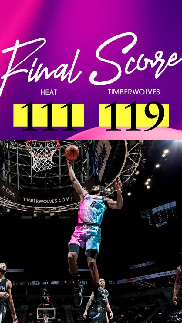 NBA常规赛,热火客场挑战森林狼。两支球队目前均遭遇了两连败,森林狼在缺少唐斯的情况下,森林狼两战均是大比分输球,但状元郎爱德华兹成为了新秀里首个拿到1000分的球员。热火在对阵太阳和掘金两支劲旅的比赛中毫无抵抗之力,目前已经跌到了东部第七,面对弱旅,他们急需一场胜利。本场唐斯迎来复出。一开场,巴特勒连拿9分帮助热火取得领先,森林狼连中4个三分缩小分差,热火持续发力保持优势,热火领先11分结束首节。次节比赛,热火半节仅得4分,森林狼轰出一波20-4反超5分,阿里扎连续命中三个三分个人半场得到16分,双方打成61平进入下半场。易边再战,双方打得难解难分,比分交替领先,巴特勒和德拉季奇联手拿到10分帮助热火领先5分结束第三节。末节争夺,热火状态全无,森林狼越战越勇取得两位数领先。唐斯虽然六犯离场,但热火没能挽回败局。最终,森林狼战胜热火,结束两连败的同时送给对手三连败。