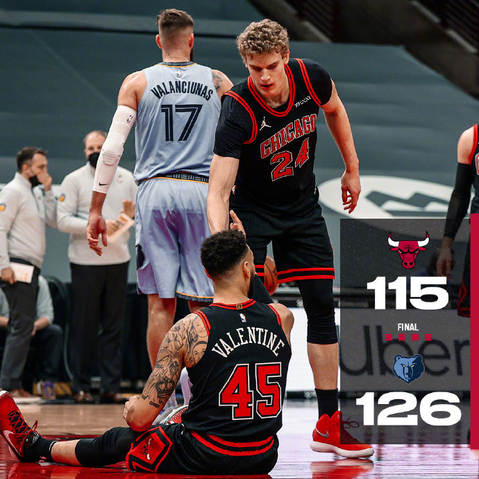 NBA常规赛灰熊对阵公牛,刚开场两队就连续在外线对飚三分,虽然灰熊一度取得领先,但公牛马上追上比分。第二节轮到公牛率先发力掀起攻势,灰熊进攻内线再度追平比分,场上局势仍旧胶着,上半场结束时两队打成57平。下半场回来虽然公牛进攻仍旧表现不错,武切维奇频频砍分,但他们防守不佳被灰熊打出高潮拉开比分,第四节灰熊将领先优势稳定在两位数,公牛无力回天,最终灰熊126-115送给公牛5连败。