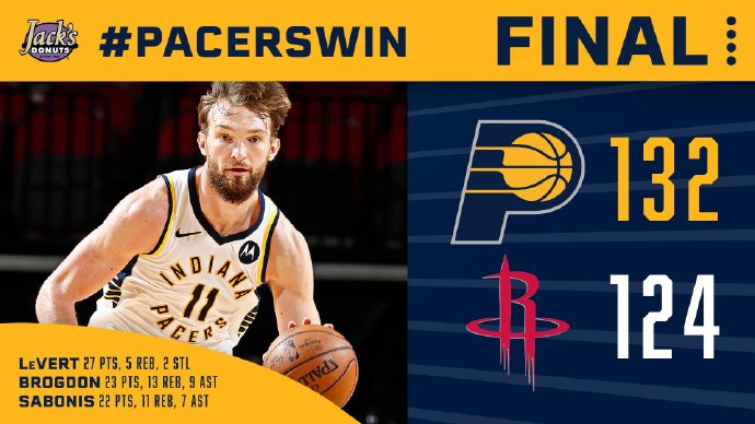 NBA常规赛,火箭坐镇主场迎战步行者,火箭已经遭遇三连败,步行者则刚刚输给快船,本场特纳因伤缺阵。开场两队即火力全开,但步行者明显延续性更好,内外兼备,勒韦尔和霍勒迪各中两记三分,萨博尼斯则在禁区翻江倒海,很快带领球队获得领先,火箭则由沃尔连得九分止血,首节结束步行者33-24领先。次节上来,步行者打出小高潮,一举领先到20分,火箭则由波特,沃尔,伍德轮番单打止血,兰姆本节手感火热,连续投中,半场结束,步行者75-55保持20分领先。易边再战,奥利尼克开局连得七分,步行者则延续上半场火热手感,连续命中远投,火箭不断进攻禁区蚕食分差,步行者由萨博尼斯连续在内线单打命中,三节结束,分差缩小到12分。步行者106-94领先。末节火箭内突外投,打出一波攻势,将分差缩小到个位数,此后两队陷入拉锯战,分差维持在十分上下没能继续迫近,萨博尼斯篮下扣篮基本杀死比赛,最终步行者132-124战胜火箭,送给对手四连败。
