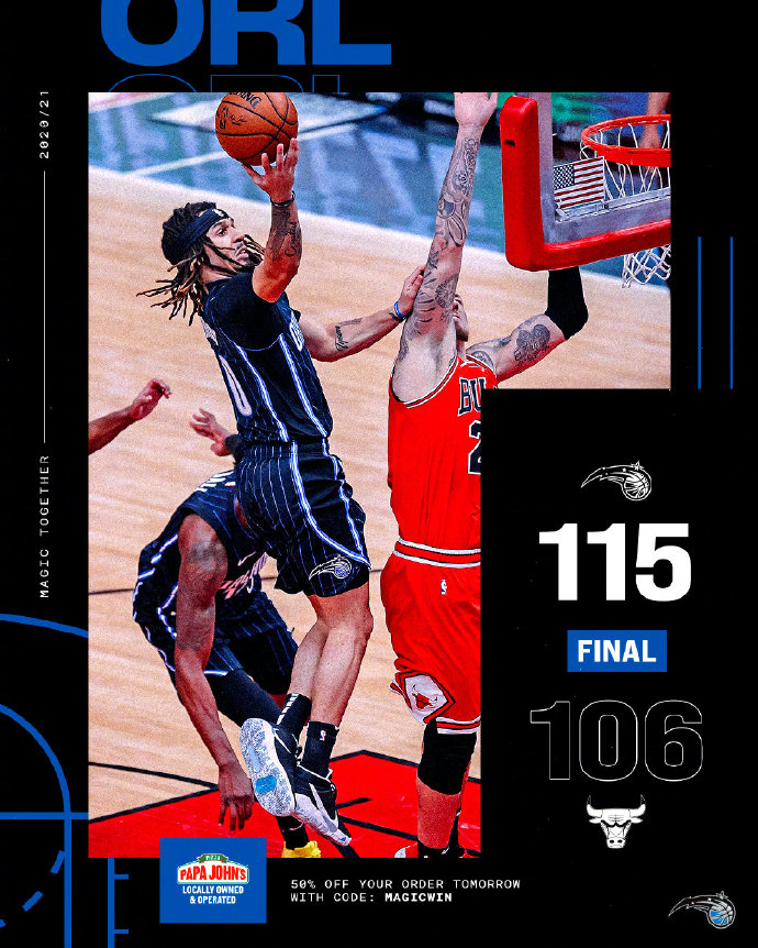 NBA常规赛,公牛主场迎战魔术。公牛近期遭遇了三连败,目前排在东部第十,领先身后的球队仅两个胜场。魔术更是遭遇了六连败,排名仅高于活塞,列东部倒数第二。一开场,双方均很快进入状态,连续投篮命中,魔术多点开花,领先10分结束首节。次节初段魔术延续火力继续保持领先,后半段公牛突然发力,一波12-3将半场分差缩小到1分。易边再战,武切维奇里突外投帮助公牛咬住比分,无奈魔术火力全开连中四个三分,三节打完魔术领先21分。末节争夺,公牛如梦方醒,拉文连续三分将分差缩小到个位数,恩尼斯三分杀死比赛。最终,魔术客场战胜公牛,结束六连败的同时送给对手四连败。