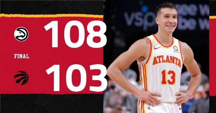NBA常规赛,猛龙坐镇主场迎战老鹰,猛龙上一场刚刚遭遇败仗,老鹰则是已经取得两连胜,本场比赛特雷-杨、加里纳利、科林斯、范弗利特等多人缺席,洛瑞轮休。开场两队外线手感不佳,得分集中在禁区,随后古德温飙中第一记三分,率领老鹰打出9-0小高潮拉开比分,但很快猛龙又将比分追平,节末西亚卡姆连续得分,并且投中猛龙本场比赛第一记三分,老鹰也在外线予以回应,首节结束,老鹰28-27领先一分。次节两队连续在外线开炮,老鹰依靠更好的命中率逐渐拉开分差到两位数,猛龙则由西亚卡姆苦苦支撑,中场结束前0.6秒,许尔特接后场发球空接上篮打进,老鹰66-54领先猛龙。易边再战,猛龙一度将分差缩小到六分,但是博格丹作为主攻点带领老鹰很快稳住局面,猛龙也没有保持进攻延续性,只能强打篮下得分,三节结束老鹰依然领先12分。末节猛龙篮下连续打成再度蚕食分差,但是外线手感依旧惨淡,反观老鹰,以博格丹为首的射手群保持火热的外线手感,很快重新拉大分差,最后两分钟弗林连中四记三分,但已无力回天,老鹰108-103击败猛龙取得三连胜。