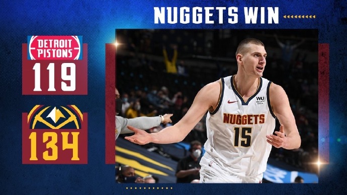 NBA常规赛掘金主场对阵活塞,戈登加盟掘金后如鱼得水,掘金也是取得5连胜佳绩,开场后活塞首先进入状态取得领先,不过随着约基奇开始发力,他带领掘金追上并反超比分。第二节掘金延续进攻状态,他们多点开花将分差拉大到两位数,虽然活塞一度通过反击缩小分差,但约基奇又带领掘金掀起高潮在上半场结束时以76-56领先到20分。下半场虽然活塞多次通过外线三分追分,但掘金始终保持不错进攻状态,最终掘金134-119轻松击败活塞取得6连胜。