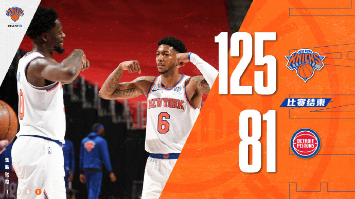 NBA常规赛,活塞主场迎战尼克斯,尼克斯最近已经三连败掉落至东部第七,活塞虽然上一场取胜,但依然东部垫底。比赛上来,尼克斯就打出11-0开局,随后兰德尔和布洛克外线手感火热继续连中三分,活塞只有约瑟夫状态在线,首节结束尼克斯就领先26分。次节双方命中率都不高,尼克斯抓住机会一度将分差拉开至30分以上,但末段活塞打出一波小高潮将分差追至19分。下半场回来,格兰特带领活塞继续追分,但兰德尔和布洛克的外线三分手感依旧不错,三节结束,尼克斯依然领先27分。末节尼克斯众将将分差拉开至30分以上,随后替补三分全开将分差越拉越大,最终尼克斯狂胜活塞44分,终止3连败。