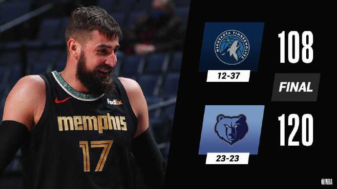 灰熊坐镇主场迎战森林狼,目前灰熊排名西部第10,距离第8的马刺还有1.5个胜场,森林狼是他们冲击季后赛道路上必须拿下的对手,此役卢比奥因伤缺阵。首节两队开局势均力敌,森林狼虽然打出8-0的小高潮,但灰熊靠着替补球员给力的发挥还是将比分反超,次节灰熊一波15-3将分差扩大到两位数,然而顽强的森林狼却用一阵三分雨将劣势抹平。下半场,森林狼一度陷入4分多钟的得分荒,好在他们抓住瓦兰丘纳斯4犯下场之际打出15-5的攻击波完成反超,但灰熊却在末节多点开花打出23-6的攻击狂潮将分差拉大到20分以上,森林狼后继乏力未能顶住对手的猛攻,最终灰熊主场120-108击败森林狼,距离西部第8只有一步之遥。