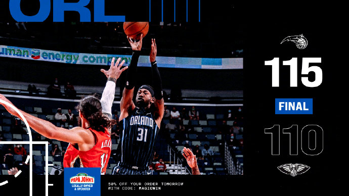 魔术(17-31):兰德尔15分6板2助3断,罗斯19分2板5助2断,恩尼斯13分4板3助4断,奥基基8分10板4助2帽,培根14分3板,卡特21分12板,波特6分3板3断,汉普顿8分4板,班巴11分5板;