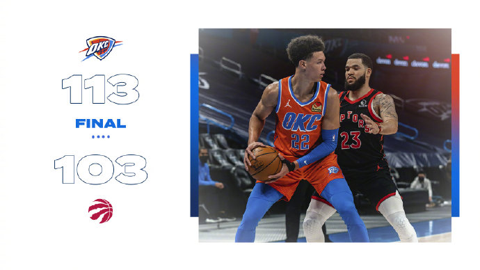 3连败的猛龙与3连败的雷霆不期而遇,此役雷霆的亚历山大、波库舍夫斯基和猛龙的洛瑞均高挂免战牌。首节猛龙下起一波三分雨,阿奴诺比、特伦特和西亚卡姆的连续六记三分率队打出17-3的攻击波早早便确立了领先优势,雷霆也不甘示弱,他们很快就回敬一波15-3缩小分差,次节猛龙的三分雨仍在继续,雷霆则靠着摩西-布朗、罗比在内线的优势紧咬比分。下半场雷霆三军用命终于反超了比分,猛龙三分命中率急剧下滑,再加上内线篮板被完爆(全场输了29个),很快便陷入被动局面,末节米哈伊柳克用连续的高光表现带领球队扩大分差,猛龙则是手感全无,单节仅得到14分,最终雷霆主场以113-103力克猛龙,终结自己三连败的同时也送给猛龙四连败。