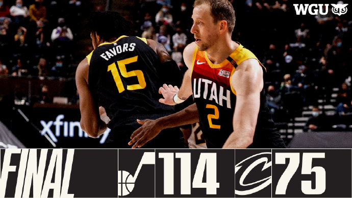 NBA常规赛爵士主场迎来骑士,爵士最近又是获得5连胜,骑士则是状态不佳遭遇2连败。开场后两队进入状态都比较慢,在米切尔投进三分后爵士逐渐找到手感,他们外线连中三分建立起两位数优势。第二节仍旧是爵士首先打出攻势,他们内外开花将分差拉大到20分以上,上半场爵士53-34领先骑士。下班回来骑士表现仍旧平平,爵士攻势凶猛不断砍分,骑士在第三节结束前再次遭遇得分荒,三节过后爵士领先38分,比赛失去悬念,最终爵士114-75血洗骑士拿下6连胜,骑士遭遇3连败。