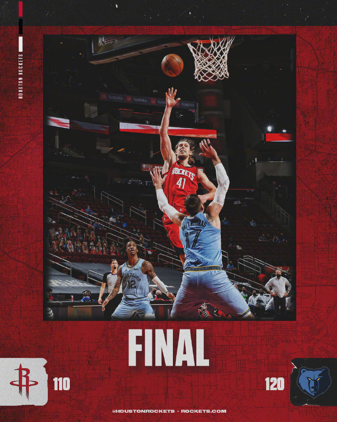 火箭主场迎战灰熊,两队上一次交手灰熊曾大胜49分,此役伍德因病缺席比赛,火箭面临巨大考验。首节火箭在中段突然发力,依靠奥古斯丁的三分和奥利尼克的内线强攻打出一波15-0的攻势确立了两位数的领先,灰熊则在节末抓住火箭的松懈回敬一波7-0迫近比分,次节两队再次经历了一波三折的剧本,灰熊在开局被动的不利局面下打出14-0的高潮反超比分,火箭则在泰特和奥利尼克上场后及时止住颓势,两队以57平结束上半场。第三节轮到火箭开局发力,波特和泰特双星闪耀为球队确立两位数的领先,而灰熊则在后半节用一波10-0迎头赶上,末节火箭命中率急剧下降,灰熊则依靠内线的优势牢牢掌控局面,瓦兰最后时刻连得8分为球队锁定胜局。最终,灰熊客场120-110击败火箭。