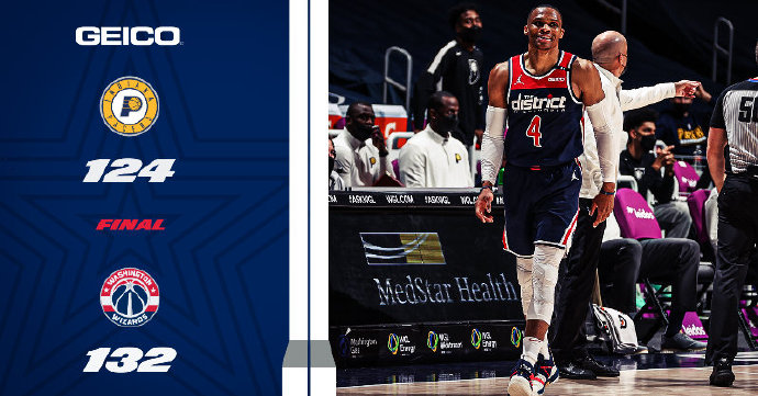 奇才(18-28):威斯布鲁克35分14板21助2断、八村塁26分8板3助、阿夫迪亚12分8板、内托15分4板、加福德11分6板2帽、哈奇森18分5板