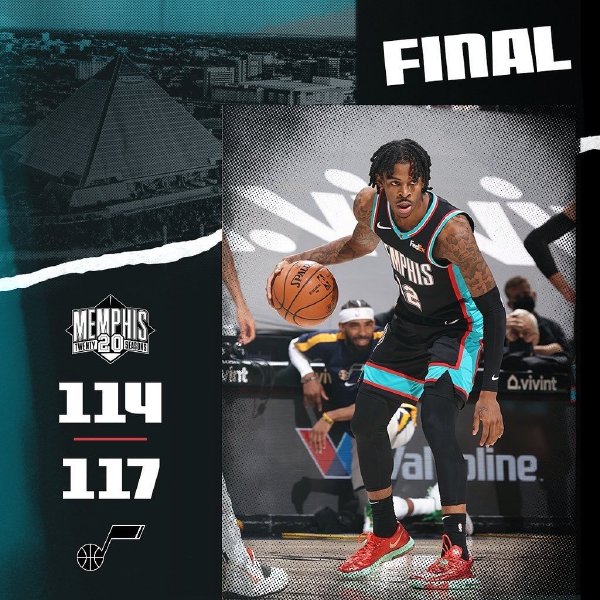灰熊(21-21):莫兰特32分11助攻4篮板、布鲁克斯22分、阿伦17分5篮板、瓦兰丘纳斯14分18篮板2助攻2盖帽、克拉克13分5篮板5助攻、安德森5分6助攻5篮板2抢断、温斯洛4分4篮板、琼斯4分3篮板、贝恩3分