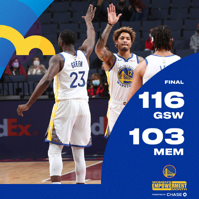 NBA常规赛,灰熊主场迎来勇士的挑战,前者上一场依靠莫兰特最后的准绝杀险胜热火目前排名西部第10位,后者上一场也是轻取火箭排在西部第9位,但库里因为尾椎骨受伤缺席本场比赛。开局阶段,没有库里的勇士进攻勉强与灰熊抗衡,凭借着维金斯末段的神勇发挥,勇士一波进攻高潮领先8分进入次节,次节灰熊还是没有找到手感,后半节勇士依靠维金斯和普尔火热的外线手感继续拉大比分,半场结束勇士领先19分。易边再战,灰熊连续失误,打不出自己的进攻节奏,勇士抓住机会内外开花将分差拉大,梅尔顿和温斯洛的三分帮助灰熊追回一些分差,勇士依然领先19分,末节灰熊在内线找到机会追回一些分差,勇士依然依靠积极性守住20分的优势,后半节成为练兵时间,最终勇士轻取灰熊。