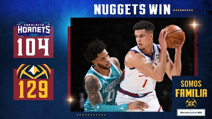掘金主场挑战黄蜂,这是一场东部第5迎战西部第5的正面对决。此前取得4连胜的黄蜂手风颇顺,上来便取得15-6的梦幻开局,然而掘金也不甘示弱,靠着米尔萨普和约基奇在内线的优势他们很快将分差抹回,次节多齐尔、小波特又火力全开,掘金半场便取得了两位数的领先优势。下半场掘金乘胜追击,连续的转换进攻打得对手晕头转向,穆雷、小波特百步穿杨、约基奇则三节不到便砍下三双,黄蜂一溃千里,分差被拉大到将近30分,最后一节也彻底沦为垃圾时间。最终,掘金主场129-104大胜黄蜂。