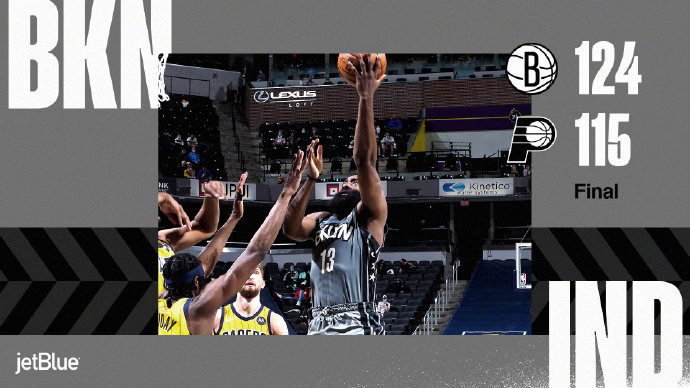 已经5连胜的篮网客场迎战步行者,此役欧文缺阵,哈登单核带队冲击6连胜。首节哈登一如既往的扛着球队前进,球队进攻在他的梳理下是井井有条,然而当哈登下场后篮网突然断电,步行者在萨博尼斯的带领下打出16-3的攻击波将分差拉大到15分之多,次节哈登上场后重新掌握比赛节奏,一波11-2将分差拉回,步行者进攻效率明显下降,半场结束时领先优势被缩小到只有3分。下半场,哈登的抛投帮助球队终于追平比分,步行者在末节进攻乏力,篮网趁机扩大优势,关键时刻哈登开启巨星模式接管比赛,步行者对此无能为力,最终篮网124-115逆转步行者豪取6连胜。