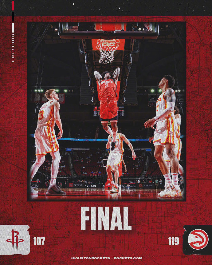 NBA常规赛火箭主场对阵老鹰,火箭近来已经创队史的遭遇16连败,反观老鹰近来状态不错取得5连胜。开场后虽然火箭首先进入状态,但特雷-杨和加里纳利先手找到手感帮助老鹰在首节便取得两位数优势,第二节老鹰外线手感火热一度将分差拉大到23分,但奥拉迪波和波特两人联手又为火箭咬住比分,上半场老鹰73-58领先火箭。下半场回来火箭在奥拉迪波的带领下掀起反扑,他们外线连中三分在三节结束时将比分追到只差1分。但第四节老鹰迅速调整重新建立领先,最终老鹰119-107送给火箭17连败。