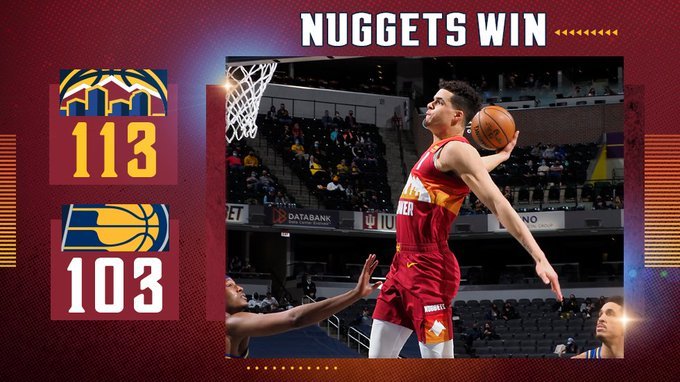 NBA常规赛,步行者今日坐镇主场迎来掘金的挑战,前者上场战胜骑士后暂列东部第九,后者状态不错三连胜排在西部第七的位置,本场比赛掘金由于健康管理协定和伤病,米尔萨普、坎帕佐多人缺阵。首节比赛双方状态不错,先是掘金上来就打出一波13-2得到领先优势,随后掘金突然哑火,步行者则火力全开,依靠特纳和霍勒迪的三分和全队的反击突然打出一波17-0又将分差反超6分,最后几分钟掘金依靠穆雷和巴顿的发挥将分差缩小到1分。次节比赛掘金上来手感继续火热,内线外线多点开花将分差反超6分,而步行者本节手感不佳依靠特纳的冲抢咬住比分,掘金最后依靠全队发挥领先步行者9分结束次节。易边再战,双方上来进攻效率不高,掘金则是连续失误被步行者抓住机会一举将比分扳平。掘金暂停调整后约基奇开始发挥连续助攻队友打进帮助掘金重新取得8分领先,双方对攻几个后掘金继续保持8分领先进入末节。末节之争,步行者上来突然哑火,而掘金则是火力全开波特连续飙进3分,穆雷反击也不断打进,掘金打出一波17-7将分差扩大到18分。末节最后时刻步行者连续飙进3记三分强行保持比赛悬念,但是最后时间不够步行者追分未果,最终掘金113-103战胜步行者迎四连胜。