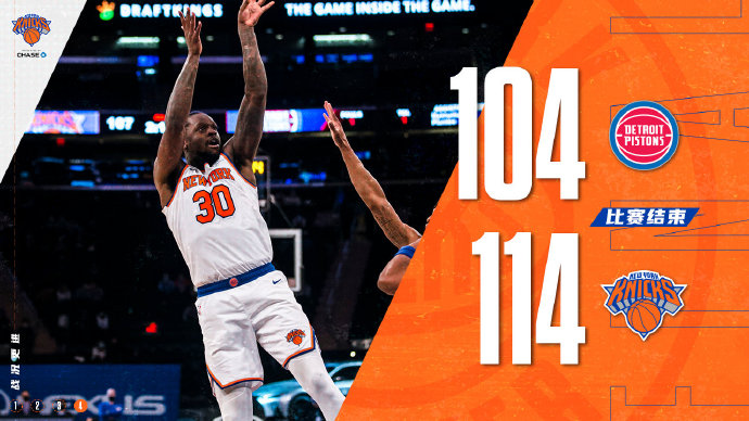 NBA常规赛,尼克斯今天主场迎战活塞。尼克斯在上一场比赛中不敌马刺结束连胜,目前以50%的胜率位居东部第五。而活塞则是继续东部垫底,但他们在上一场表现出色,普拉姆利和史密斯同场拿到了三双,球队也大胜东部劲旅猛龙。本场比赛罗斯因为健康和安全协议将继续缺阵,活塞这边除了传出买断消息的格里芬以外,格兰特和约什-杰克逊都在伤病名单中无法出战。首节比赛尼克斯利用主场之利早早进入状态,兰德尔独得10分率队取得领先,第一节结束时尼克斯33-27领先6分。次节比赛前半段两队你来我往陷入僵持,后半段活塞突然断电,又是兰德尔带队打出11-0的攻击波,半场结束时尼克斯59-46领先13分。易边再战,双方展开对攻,分差一直维持在10分以上,活塞后劲不足,尼克斯持续发力拉大分差,尼克斯93-74领先19分结束第三节。末节争夺,活塞率先发力迫近比分,尼克斯多点开花维持住两位数的领先,活塞最多只把分差迫近到落后8分,时间所剩无几,最终尼克斯主场取胜。