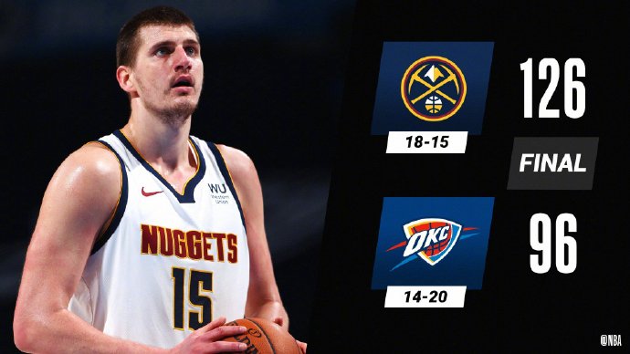 掘金今日前往俄城挑战雷霆,双方前两次交锋都以掘金的胜利告终,此役他们也是势在必得。首节比赛,雷霆攻防两端全部掉链子,掘金上来就反客为主奉上13-0的攻击波,波特单节三分4中4砍下14分,在他和约基奇的带领下掘金全队火力全开,很快便确立了18分的领先优势。次节雷霆利用对手主力下场的间隙,靠着杰罗姆、K-威廉姆斯等人的努力一度将分差迫近到11分,但当掘金主力重回场上后,局势再次失控,掘金送出18-5的攻势将分差拉大到22分。第三节雷霆外线依旧失准,防守端霍福德又被约基奇完全压制,约老师两节半即砍下三双,掘金多点开花一举确立了30分的领先优势。末节因为分差过大,两队早早撤下主力开始练兵,比赛彻底失去悬念,最终掘金客场126-96击败雷霆。