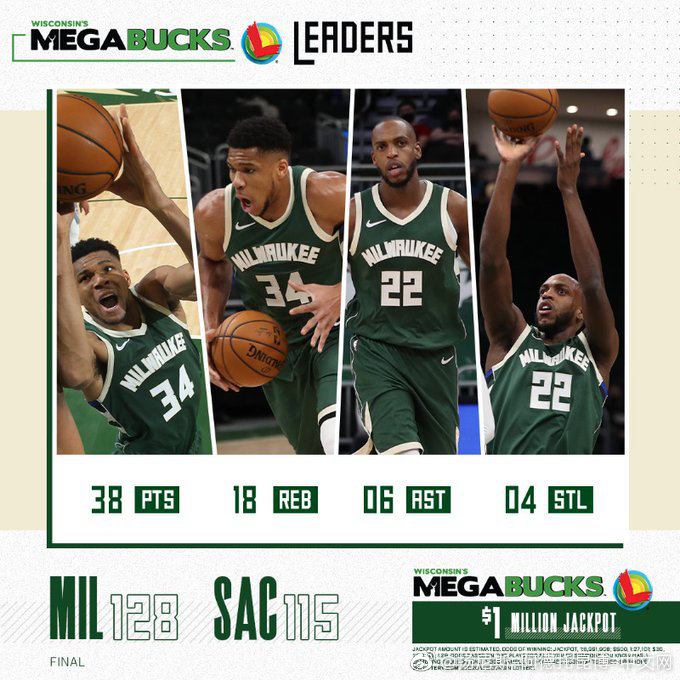[微博全场集锦] 字母哥38+18 米德尔顿32+8+6 雄鹿送国王七连败