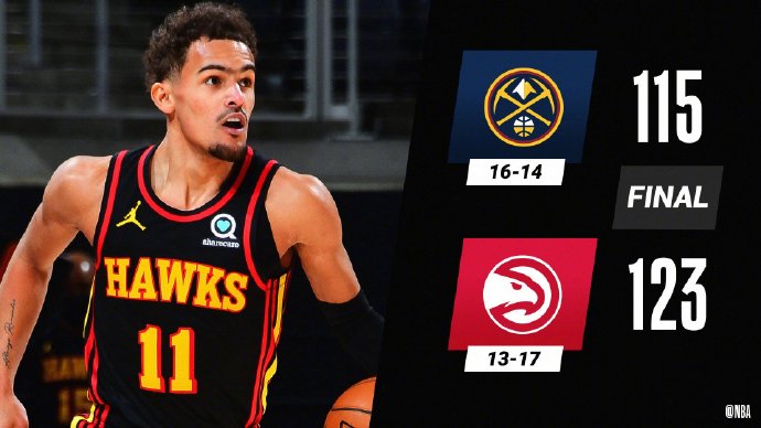 老鹰今日坐镇主场应战掘金,伤兵满营的老鹰近来状态不佳,近6场比赛输了5场,掘金这边穆雷则状态爆表,上一场爆砍50分率队取胜。首节约基奇十分低迷,仅仅依靠罚球得到1分,好在掘金角色球员给力,波特和波尔联手轰下15分帮助球队确立了6分的领先优势。次节加里纳利率领一众替补们打出一波13-0一举将比分反超,掘金则依靠巴顿和莫里斯勉力支撑,怎料许尔特和特雷-杨上场后又是一波15-3的攻击波,老鹰半场已然反超8分。第三节,特雷-杨开始自己的表演,连续两记超远三分点燃全场激情,单节爆砍14分,再加上卡佩拉肆虐篮下,掘金彻底被打懵,分差也被拉大到17分。末节,掘金在穆雷的带领下不断蚕食分差,无奈之前挖的坑太大,特雷-杨上场后重新掌握场上主动权,最终老鹰以123-115击败掘金。