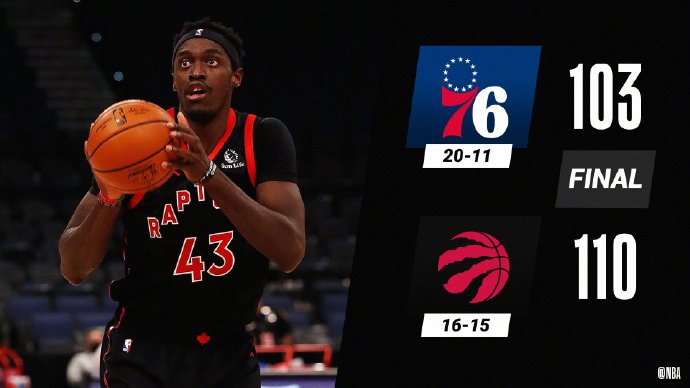 NBA常规赛猛龙主场迎战76人,76人近来取得2连胜仍旧占据东部榜首,猛龙也状态不错拿到3连胜。开场后76人率先打出攻势取得领先,随后西亚卡姆接连为猛龙追分,范弗里特连中4个三分帮助猛龙反超比分。第二节西蒙斯和哈里斯两人先后强攻篮下帮助76人夺回领先,上半场76人55-52领先猛龙。第三节两队仍旧打得互不相让,76人内线占据优势,猛龙则三分越投越顺,第四节布歇异军突起接连砍分帮助猛龙确立领先。76人则在进攻端陷入挣扎,最终猛龙110-103成功逆转76人取得4连胜。