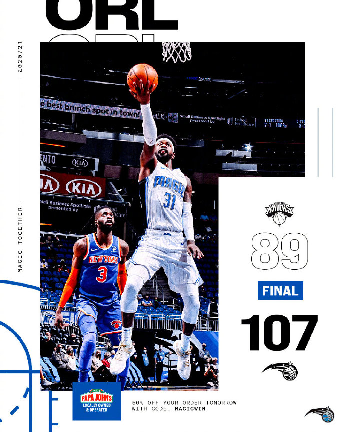 三连胜的尼克斯今日做客奥兰多迎战魔术,此役魔术大将富尼耶和阿米奴复出,科尔-安东尼、恩尼斯、戈登继续缺席,尼克斯方面米切尔-罗宾逊也因手骨折缺席。首节比赛魔术在对攻战中突然断电,后半节仅仅拿到6分,兰德尔则单节砍下13分,几乎以一己之力将魔术打垮。次节场上局势来了个180度大转变,魔术板凳球员下起一波三分雨将分差抹平,不过尼克斯在主力回归后,靠着佩顿与巴雷特的强势发挥又重新确立了领先优势。第三节魔术角色球员依旧给力,武切维奇和富尼耶也终于苏醒,再加上泰伦斯-罗斯的强势发挥,魔术一波流战术反超尼克斯13分。末节尼克斯进攻依旧杂乱无章,整个下半场仅得到33分,魔术则在泰伦斯-罗斯的带领下稳步前进,牢牢将分差控制在两位数,最终魔术以107-89击败尼克斯,终结了对手的三连胜。