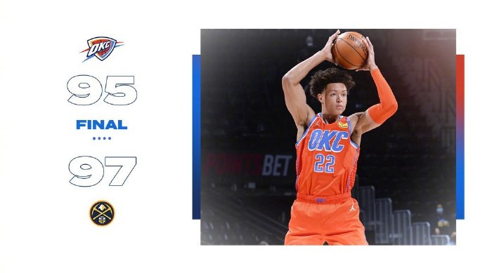 掘金坐镇主场对阵雷霆,雷霆此前两场比赛皆加时憾负湖人,而掘金则在上一场比赛中大胜骑士。首节开局,霍福德状态火热,单节他6投5中得到12分,而掘金这边稍显准备不足,失误连连,雷霆领先12分结束首节。次节掘金在换上主力后由巴顿和穆雷迫近分差,但雷霆多点开花,保持了非常高的进攻成功率,在掘金一度落后18分的情况下,约基奇利用三分及连续的二次进攻取分不断,但半场打完掘金仍落后13分。第三节雷霆队保持了不错的三分效率,霍福德、威廉姆斯接连命中,小波特利用身高优势连得6分,但杰克逊先是打成2+1之后又三分命中,这让雷霆领先9分结束第三节。末节比拼,莫里斯连得5分,巴顿三分命中助掘金缩小场上分差,关键时刻约基奇中投完成反超,这也是掘金全场第一次领先,最终掘金逆转以97-95的比分险胜雷霆。