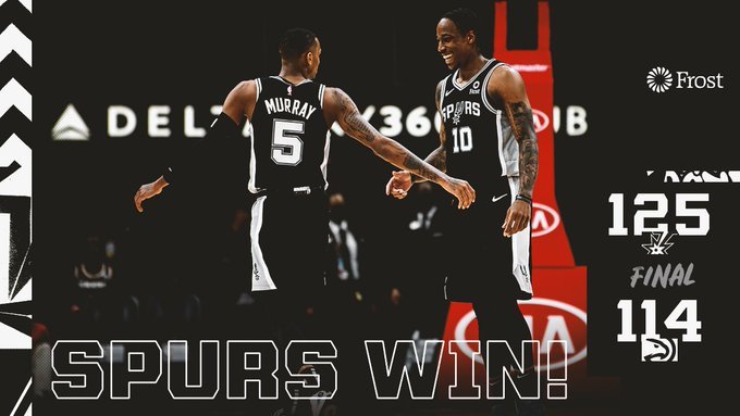 开启七连客牛仔之旅的马刺第一站来到了亚特兰大挑战老鹰。阿尔德里奇的继续缺阵,让本就捉襟见肘的马刺内线轮转雪上加霜,老鹰方面,隆多&博格达&亨特&邓恩的多人缺席则使球队后场实力大打折扣。比赛开局马刺率先进入比赛状态,状态火热的德罗赞连续打中单节14分,率领马刺占据主动,特雷-杨也独得17分给予回应,次节马刺一波41-19的进攻高潮彻底奠定领先优势,半场轰下赛季新高的77分,而老鹰在进攻端的断电,也带着29分的落后进入中场休息。第三节开场约翰逊连得10分,分差被拉开到了39分,溃不成军的老鹰只能通过卡佩拉的篮下捡漏勉强得分,而巨大的分差也使本场比赛早早失去了悬念,最终马刺在牛仔之旅的第一场比赛中,以125-114大胜老鹰,避免连败。