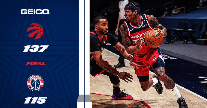 NBA常规赛,奇才今日坐镇主场迎战猛龙,猛龙上场比赛第四节逆转战胜灰熊,奇才上场也险胜公牛,本场比赛威斯布鲁克回归。比赛开局阶段,猛龙全队三分手感火热连续投进,建立优势,奇才外线失准只能内线强打或找寻突破机会得分苦苦支撑,首节结束猛龙领先12分。第二节小洛佩兹成为奇兵,内线连续打成帮奇才追近比分,猛龙在西亚卡姆、洛瑞的带领下半场结束依然保持13分的领先优势。下半场,奇才追分势头迅猛,比尔、阿夫迪亚联手打出8-0小高潮,猛龙依靠三分手感依然保持双位数领先,末节纳斯关键挑战成功,鲍威尔屡屡建功,猛龙一波11-0杀死比赛,最终猛龙137-115轻取奇才,拿到连胜。