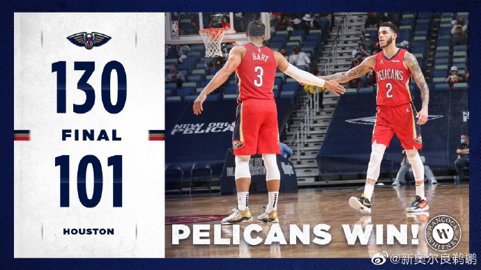 NBA常规赛火箭客场挑战鹈鹕,火箭近来遭遇2连败,鹈鹕状态反弹取得3连胜。开场后鹈鹕外线率先开张,不过火箭迅速追上比分,依靠锡安的发力鹈鹕稍稍领先。第二节虽然锡安依旧状态火热,但他收到犯规过多的困扰只得长时间在场下休息,在第二节后半段英格拉姆和哈特联手打出一波高潮帮助鹈鹕拉开比分,上半场鹈鹕63-50领先。下半场回来鹈鹕三分手感仍旧不错一度将分差拉大到20分,但火箭马上掀起反扑将比分追到10分左右。但第四节鹈鹕在外线依旧手感火热,最终鹈鹕130-101轻松战胜火箭取得4连胜,火箭遭遇3连败。