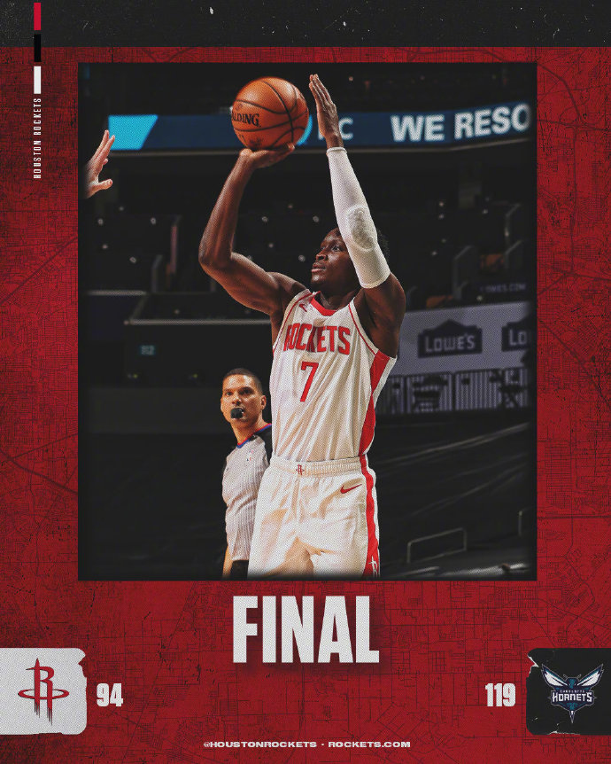 火箭今日奔赴夏洛特客场挑战黄蜂,火箭这边除了受伤的伍德外,沃尔和戈登全都轮休缺阵。缺少多名核心的火箭在开局的对攻中虽然落入下风但表现顽强一直咬住比分,次节在麦克勒莫爆发单节砍下15分的带动下一度反超比分,不过黄蜂这边鲍尔同样有着出色发挥,他半场15分5助的表现帮助黄蜂及时稳住局势并带着4分领先进入下半场。第三节的火箭虽然继续落后但打的很顽强,节末也一度追平了比分,然而第四节初莫名的哑火直接导致溃败,他们开局前7分钟里仅得1分,而黄蜂抓住机会送出19-1的攻势一举拉开比分奠定胜局,火箭这一节仅得7分。最终,黄蜂主场轻取火箭拿下比赛。