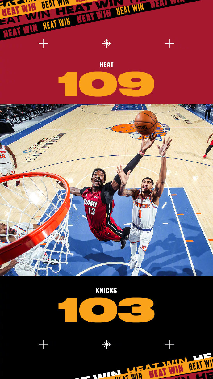 NBA常规赛尼克斯主场对阵热火,尼克斯近来取得2连胜,热火则是仅排在东部倒数第三。开场后布洛克就手感火热连中三分帮助尼克斯取得领先,不过热火逐渐打出气势完成反超,第二节场上局势仍旧胶着,虽然尼克斯一度掀起反扑完成反超,但是阿德巴约和巴特勒仍旧帮助热火以60-59领先1分结束上半场。下半场回来两队手感再次回落,不过热火仍旧靠着三分稍稍拉开比分,虽然尼克斯穷追不舍,不过关键时刻巴特勒和阿德巴约仍旧帮助热火锁定胜局,最终热火109-103力克尼克斯。