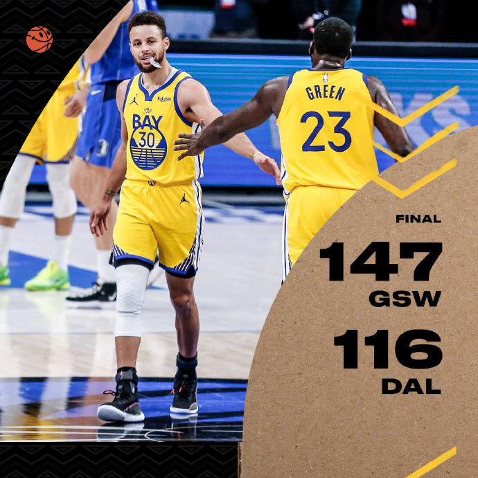 NBA常规赛独行侠主场对阵勇士,开场后东契奇接连拿分帮助独行侠取得领先,不过勇士多点开花将比分反超,勇士外线手感不错连中三分,不过独行侠迅速调整咬住比分,第二节上来独行侠就打出8-0完成反超,此后东契奇再次发挥帮助独行侠取得领先,上半场独行侠76-74领先。下半场回来波尔津吉斯手感火热连中三分,乌布雷也是状态神勇接连砍分,在第三节后半段勇士打出攻势建立起两位数优势,第四节勇士更是一鼓作气将分差拉大到20分开外,独行侠无力追分,最终勇士147-116大胜独行侠避免连败。
