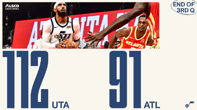NBA常规赛老鹰主场迎战爵士,特雷-杨今日缺战。开场后虽然许尔特首先拿分,但米切尔和博扬联手一波12-0帮助爵士取得领先,首节两队都失误不少,许尔特多次为老鹰追分,第二节两队手感仍旧一般,爵士还是稍稍占据优势,上半场爵士45-37领先。下半场回来在米切尔和博扬的带领下爵士打出攻势拉开比分,第四节爵士更是将分差拉大到20分开外,比赛失去悬念,最终爵士112-91轻松战胜老鹰。